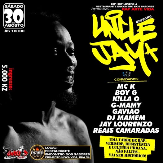 - Vou organizar um evento no dia 2025-08-30 com o tema Rap Arte Vida Especial: Uncle Jay no/a Encontro dos Sabores, Rua 54, Nova Vida clica no link para saber mais.