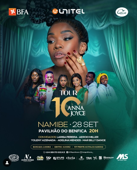 - Vou organizar um evento no dia 2024-09-28 com o tema Tour 10 Anos Anna Joyce no/a Pavilhão do Benfica, Namibe clica no link para saber mais.